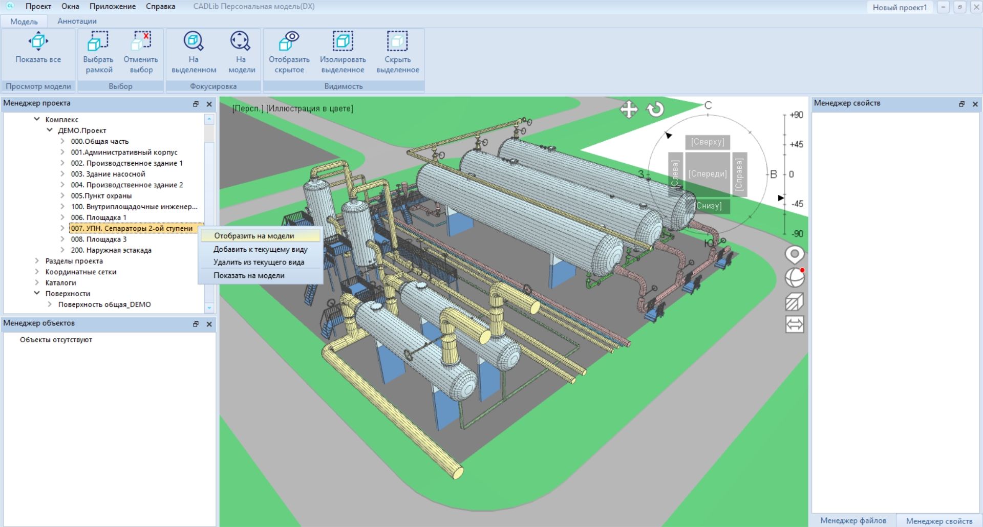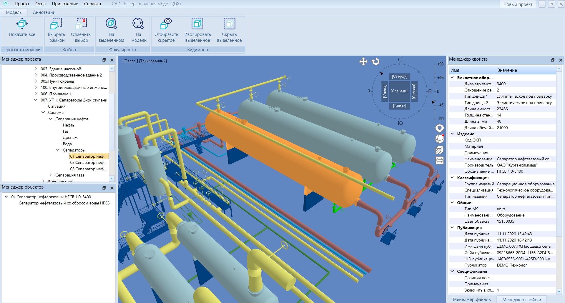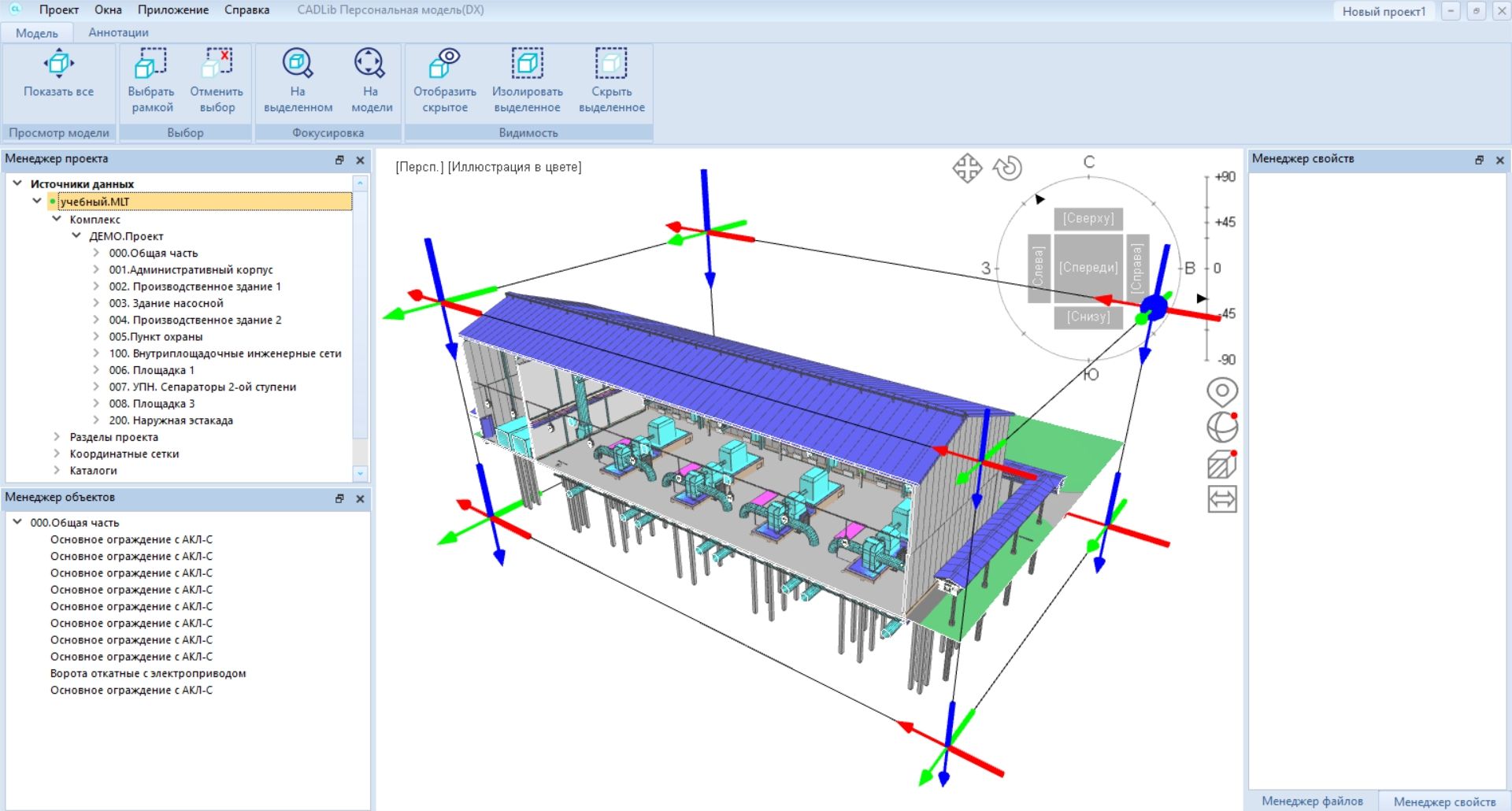 В файл MLT сохраняется информация о 3D-объектах и их атрибутах, данные об иерархиях «Комплекс» и «Разделы проекта», пользовательские выборки и классификаторы, а также файлы, связанные с 3D-объектами. Просмотр 3D-объектов происходит таким же образом, как в CADLib Модель и Архив: в программе можно показывать и скрывать объекты, связанные с определенными уровнями структуры.