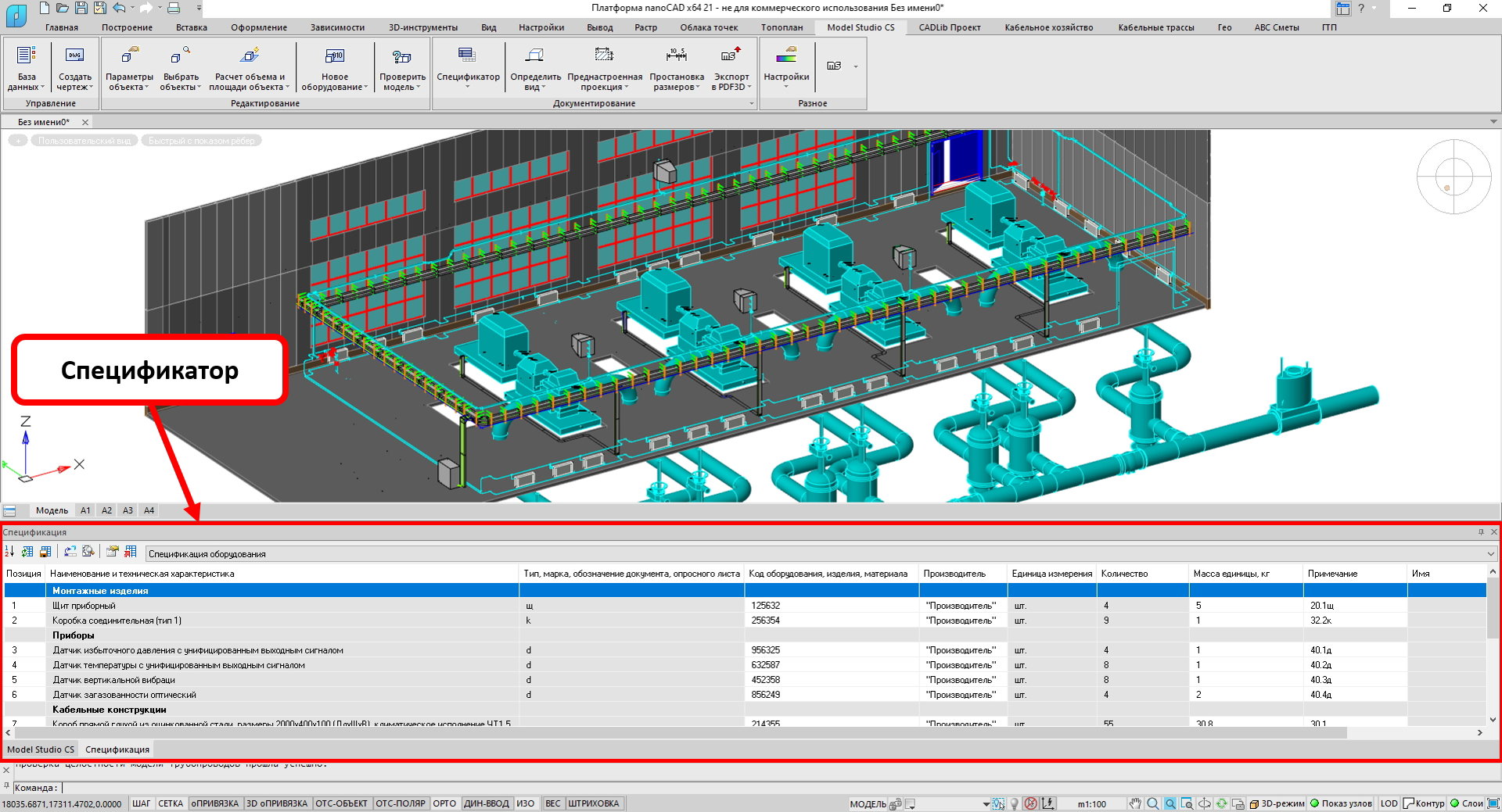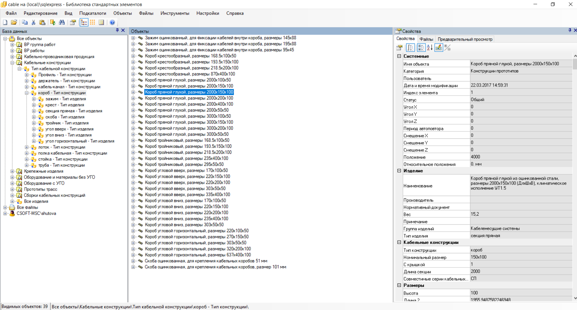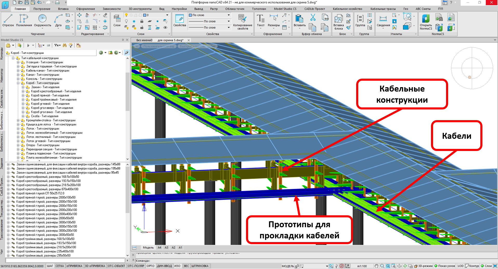 База данных программы Model Studio CS Кабельное хозяйство включает в себя информацию по специализированному оборудованию, изделиям и материалам, применяемым для выполнения трехмерной модели кабельной раскладки. Данные об объектах базы хранятся в CADLib — Менеджере библиотек стандартных компонентов для линейки программ Model Studio CS, в основу которого положена СУБД Microsoft SQL Server или PostgreSQL. Объекты базы содержат необходимый набор параметров, используемых для выполнения расчетов, разработки проектных решений и оформления проектной документации.