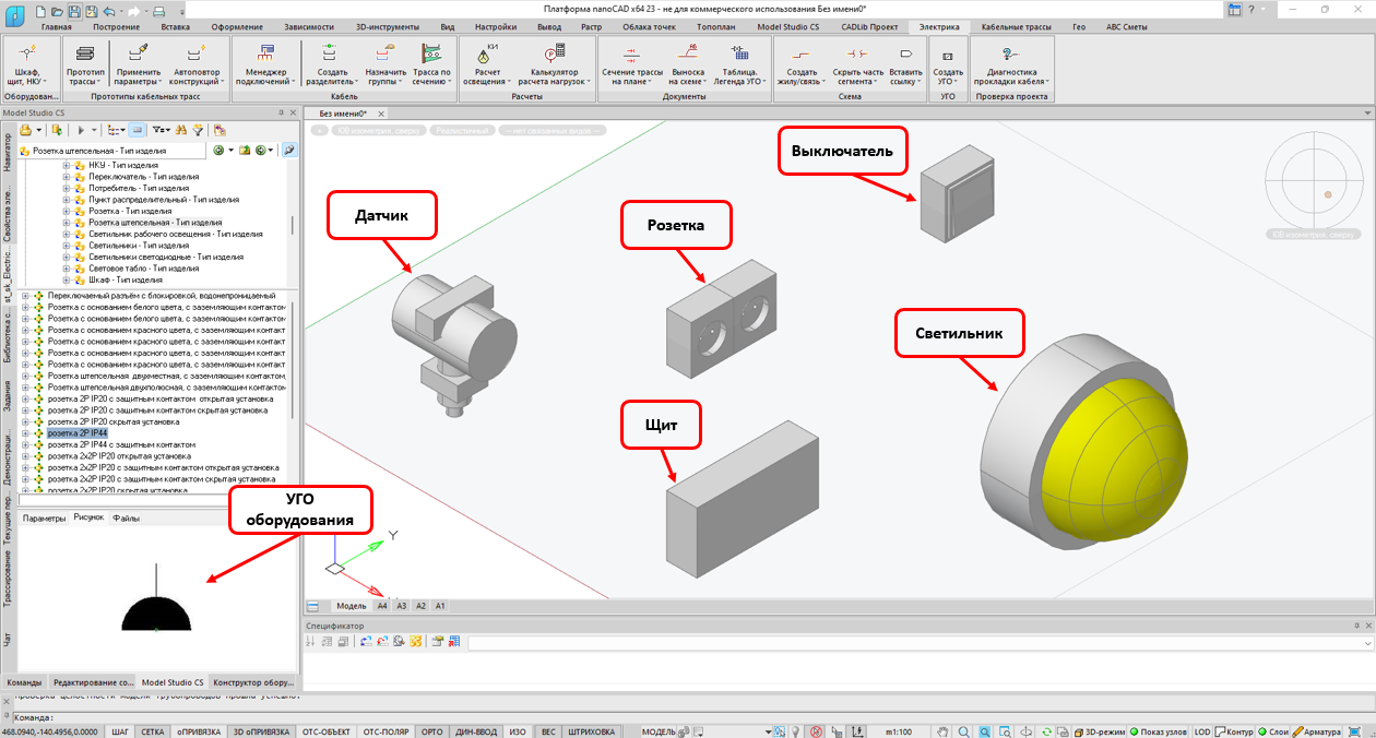 Раздел «Оборудование с УГО» содержит оборудование для создания 3D-модели. Большинство объектов имеет точки подключения кабелей и собственные условно-графические обозначения для корректного отображения на планах.